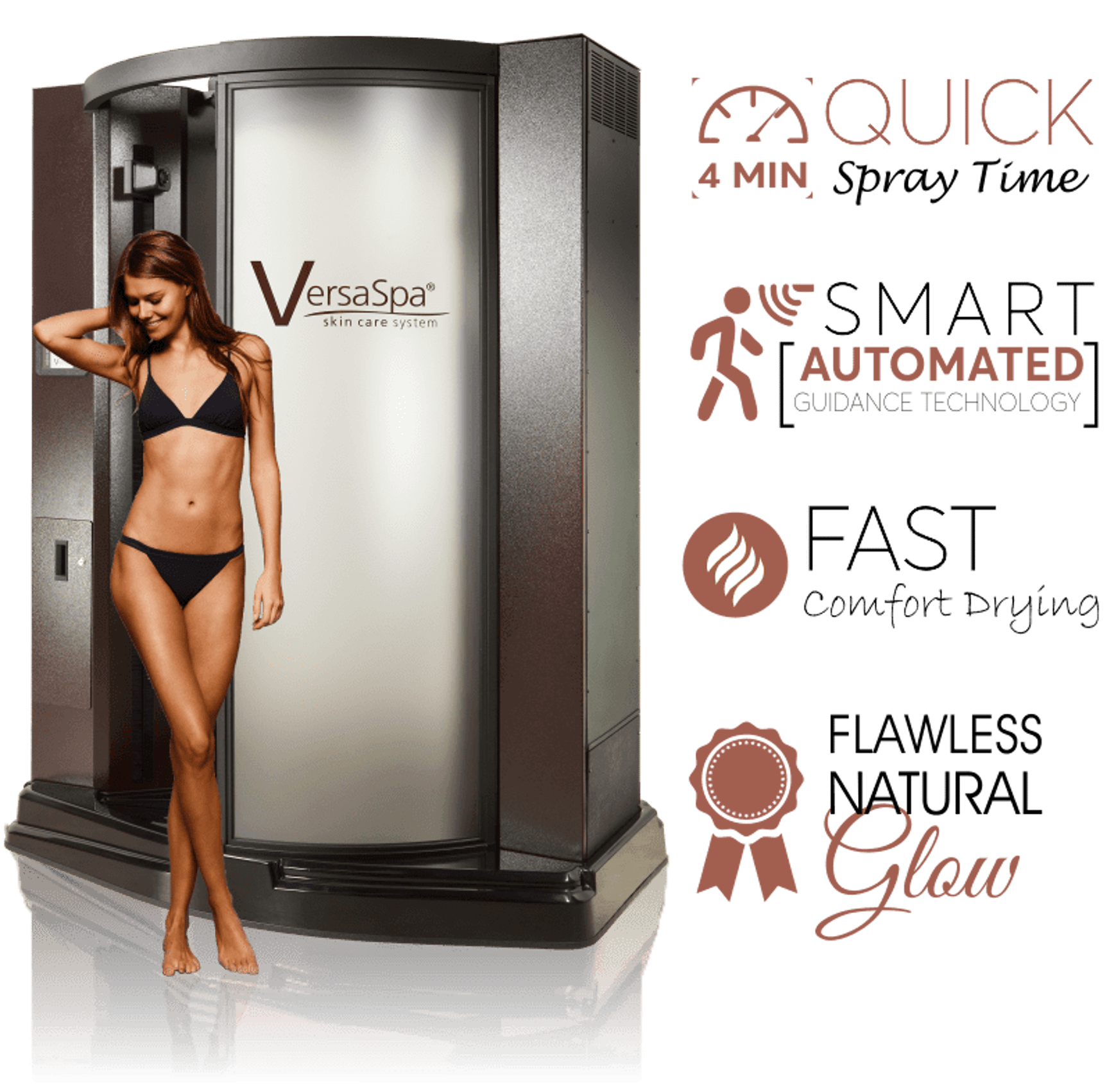 VersaSpa® has revolutionized the modern tan for over 15 years with millions of flawless tans provided. The VersaSpa® PRO features a sleek and modern design, with 3 HVLP targeted spray tan nozzles that provide even, full body coverage in just 4 simple stances.