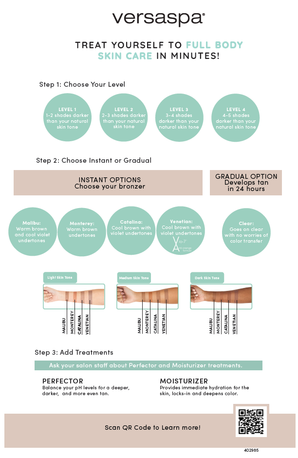 VersaSpa® Pro |Beyond Tan : VersaSpa® has revolutionized the modern tan for over 15 years with millions of flawless tans provided. The VersaSpa® PRO features a sleek and modern design, with 3 HVLP targeted spray tan nozzles that provide even, full body coverage in just 4 simple stances. As the leader in skincare science and tanning technology, your clients can expect flawless, natural bronze results, every time. VersaSpa® PRO combines advanced skincare science & tanning technology to amplify the skin’s inherent beauty. Our solutions are created with marine algae to firm, detoxify, and hydrate the skin. VersaSpa® PRO is an excellent option for customers who are not only looking for great color but care about receiving high-end skincare as well.